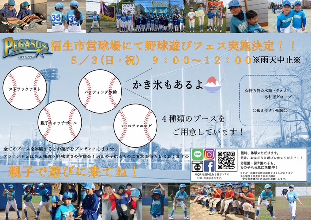 | 5月3日(日) フェス開催 9:00~12:00 親子野球 13:00~14:30 OB野球 15:00~16:30 |